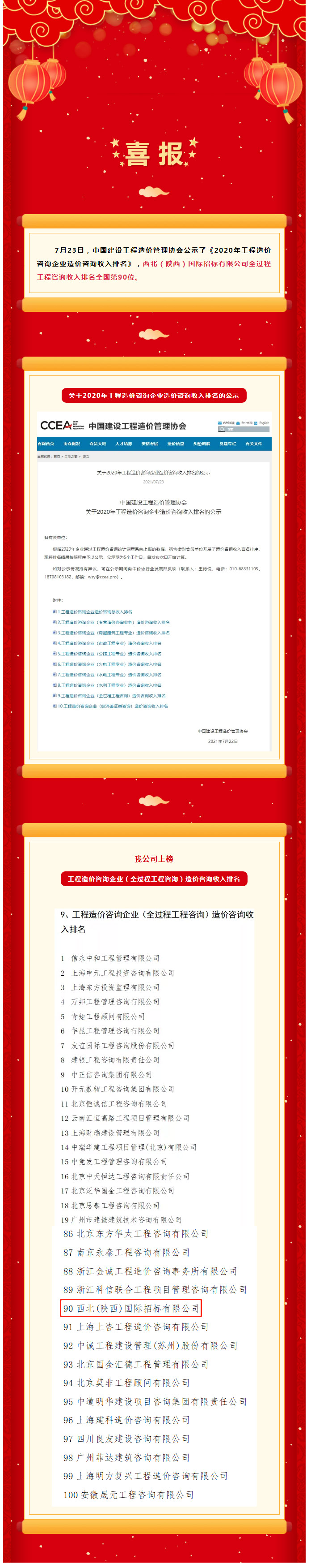 2020年工程造價咨詢企業(yè)造價咨詢收入排名公示!我公司進入100強!