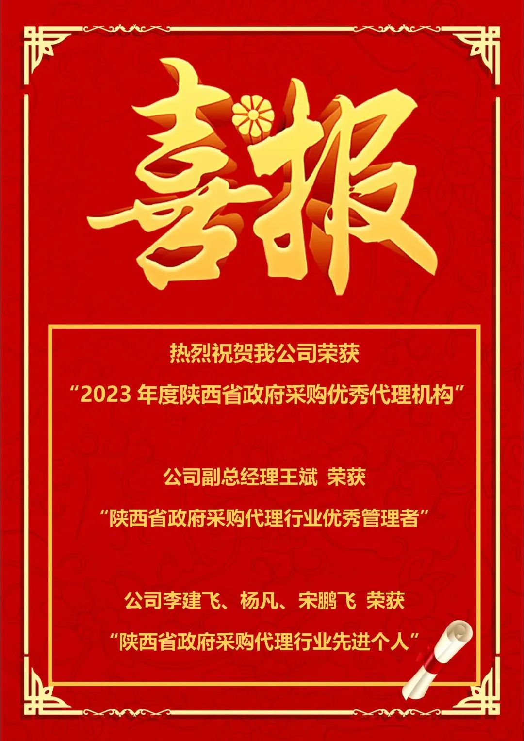 熱烈祝賀我公司榮獲 “2023年度陜西省政府采購優(yōu)秀代理機構(gòu)”