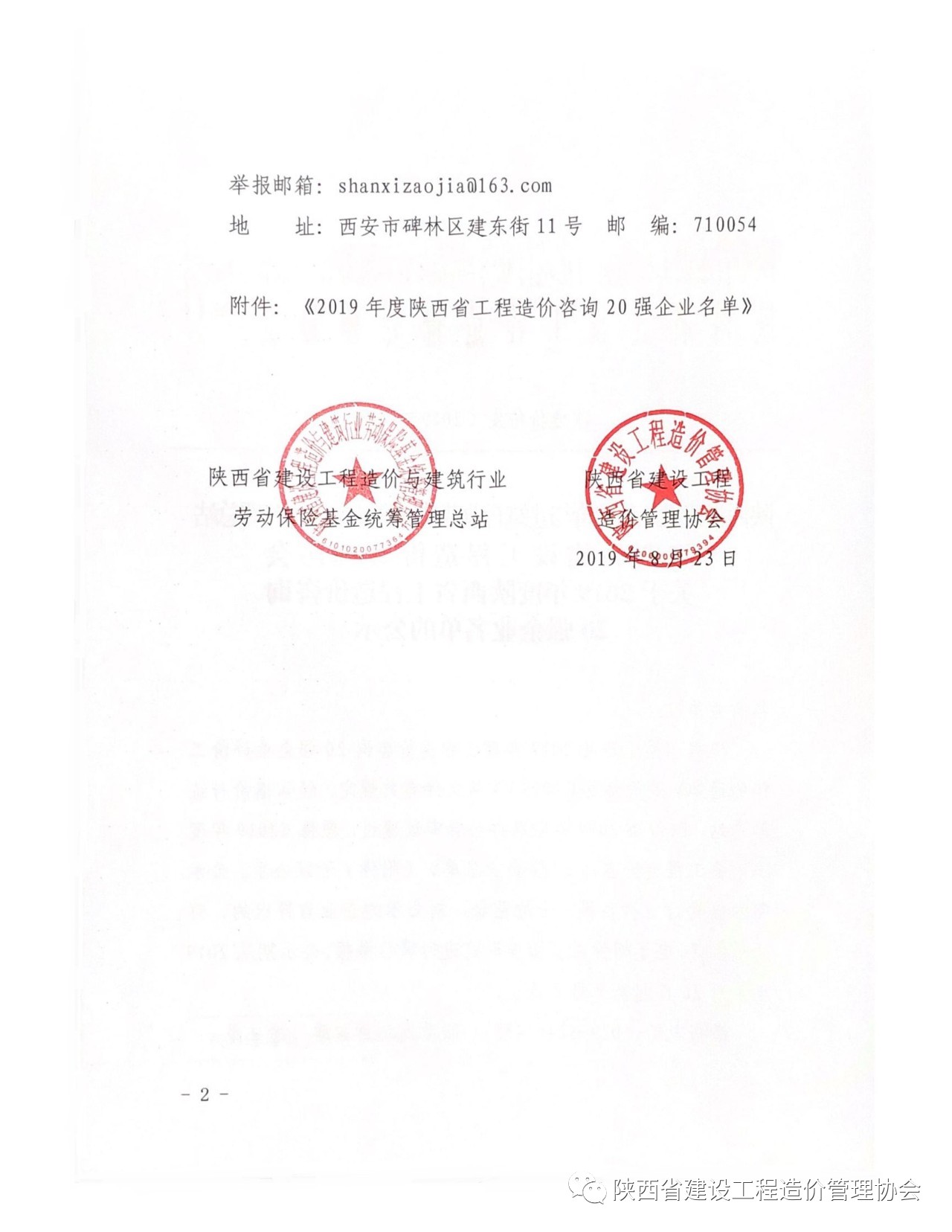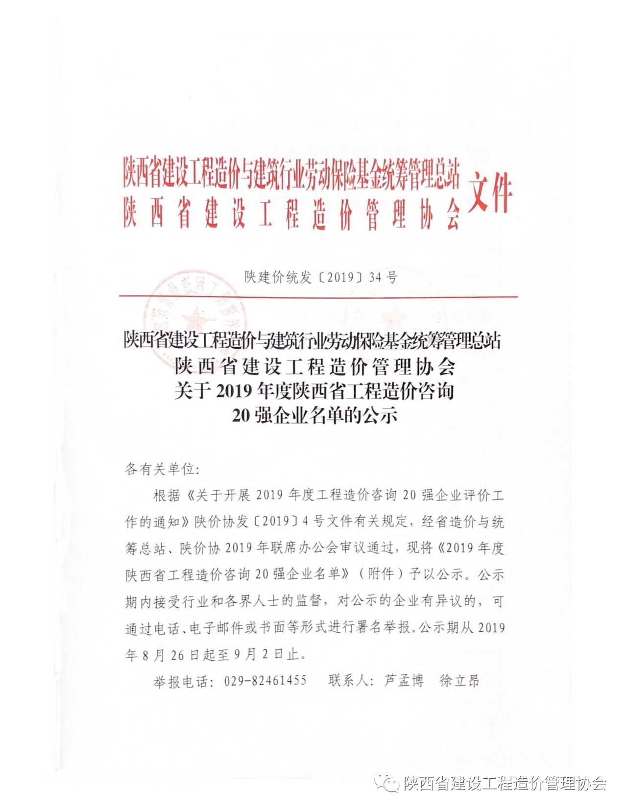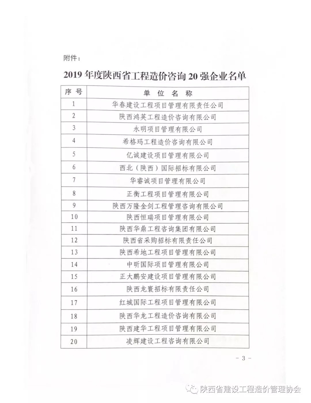 2019年8月26日,陜西省建設(shè)工程造價(jià)管理協(xié)會(huì)(簡(jiǎn)稱(chēng)陜價(jià)協(xié))發(fā)布“關(guān)于2019年度陜西省工程造價(jià)咨詢(xún)20強(qiáng)企業(yè)名單”公示,西北(陜西)國(guó)際招標(biāo)有限公司再次入圍,榮獲“第六名”。