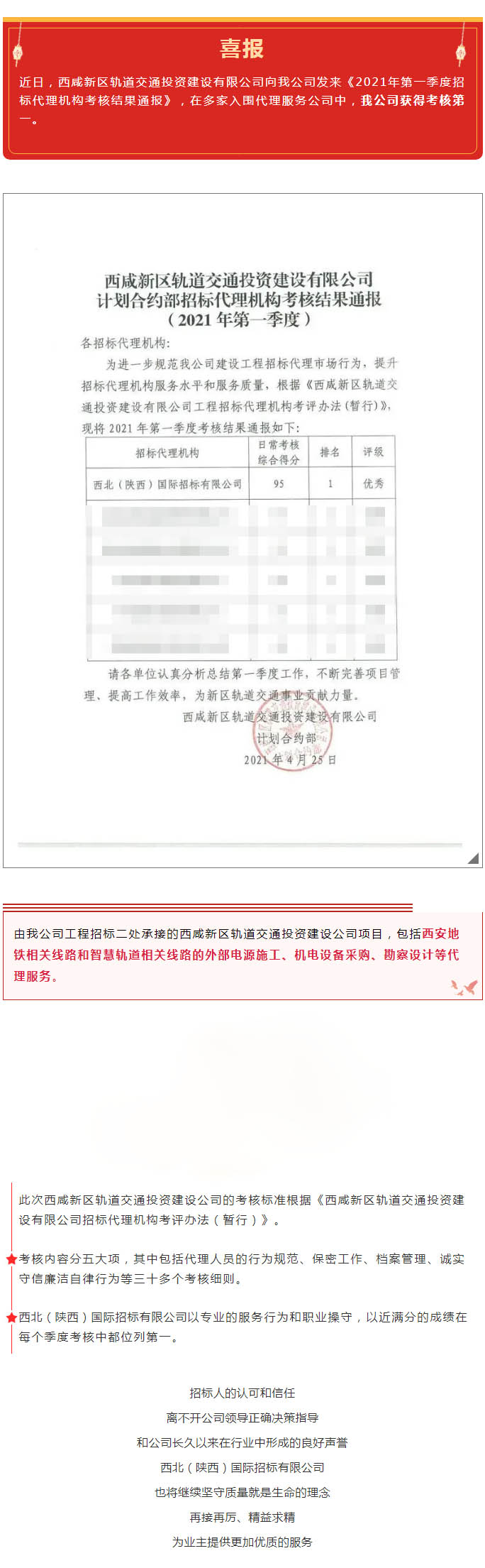 我公司獲西咸新區(qū)軌道交通投資建設(shè)有限公司《招標代理機構(gòu)考核》2021年第一季度考核第一名