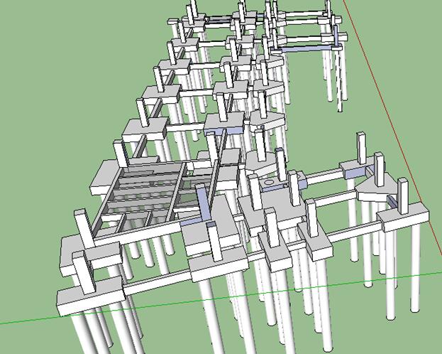 3、項目部成立BIM工作組對施工現(xiàn)場每一樓棟基礎BIM建模。因本項目依山而建,各棟教學樓標高不一,且均有走廊連接,各棟樓之間如果出現(xiàn)標高誤差后果嚴重。