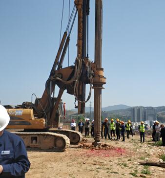 4、4月18日,組織施工單位、監(jiān)理單位、建設單位、設計單位、勘察單位進行場地第一根長螺旋鉆孔灌注樁和旋挖鉆孔灌注樁試樁的施工。