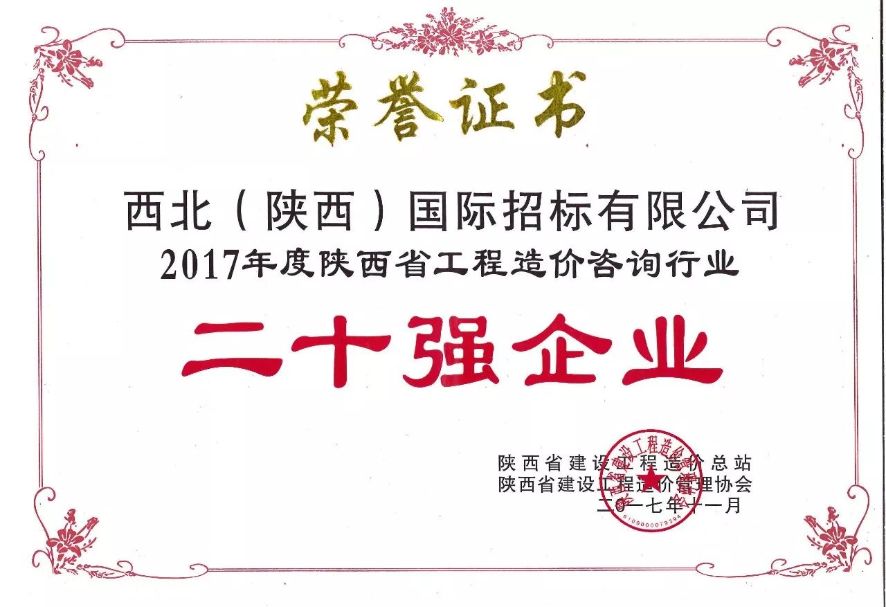 2017年11月23日,陜西省建設(shè)工程造價(jià)總站和陜西省建設(shè)工程造價(jià)管理協(xié)會(huì)發(fā)布陜建價(jià)站發(fā)〔2017〕06號(hào)文件,發(fā)布2017年度陜西省工程造價(jià)咨詢企業(yè)營(yíng)業(yè)收入排序前二十名(陜西省工程造價(jià)咨詢行業(yè)二十強(qiáng)企業(yè))名單,西北(陜西)國(guó)際招標(biāo)有限公司再次入圍,榮獲“第八名”。