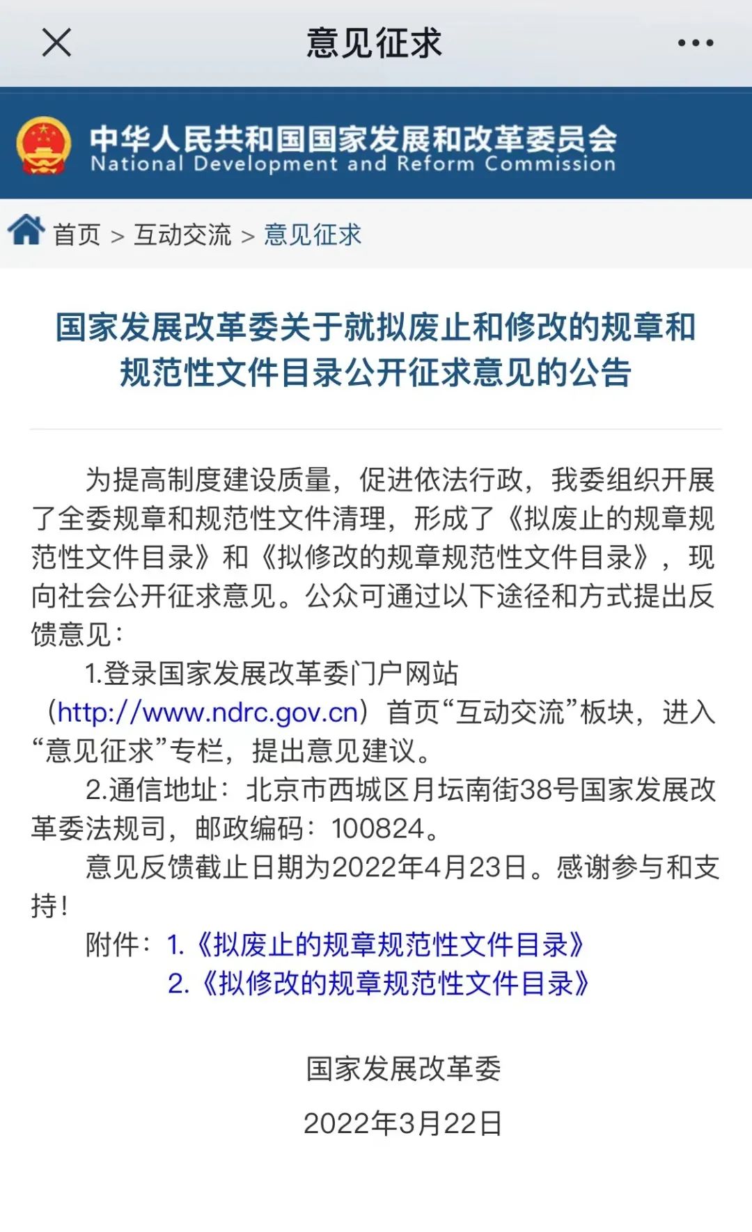 公眾可登錄國家發(fā)展改革委門戶網(wǎng)站(http://www.ndrc.gov.cn)首頁“互動交流”板塊,進入“意見征求”專欄等方式,提出意見建議。意見反饋截止日期為2022年4月23日。