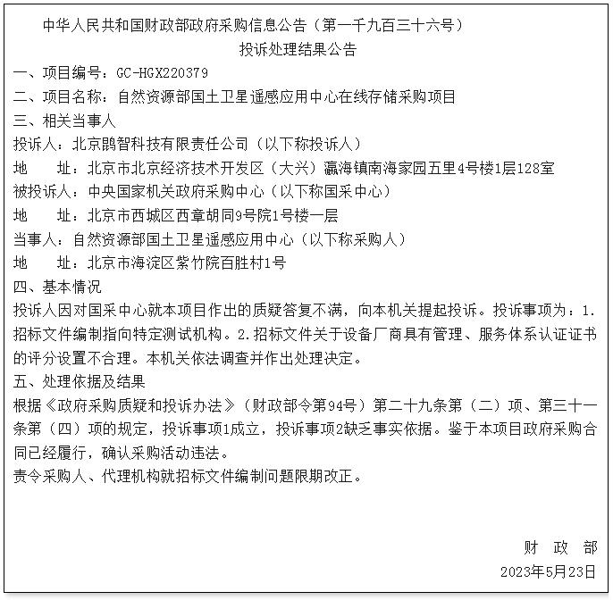 5月30日,財政部發(fā)布1936號政府采購處理意見,涉及項目為自然資源部國土衛(wèi)星遙感應用在線存儲采購項目,預算 500 萬元。